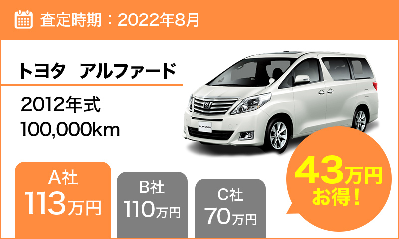 以前も車を売却した際に一括査定で複数の査定会社に見積もりをしてもらい、納得のいく金額で買取ってもらえました! 今回も乗り換えで次の車の費用の足しにしたかったので、高い査定金額で買って貰えて良かったです!また、売却の時は一括査定を使用したいと思います!